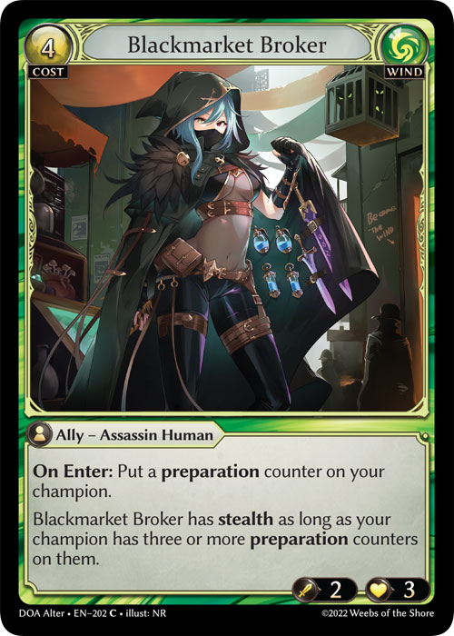 Bolster your preparation strategy with Blackmarket Broker, a tactical ally that builds your counters and evades enemy threats. When this ally enters the field, you gain a preparation counter — perfect for fueling powerful abilities later in the game.