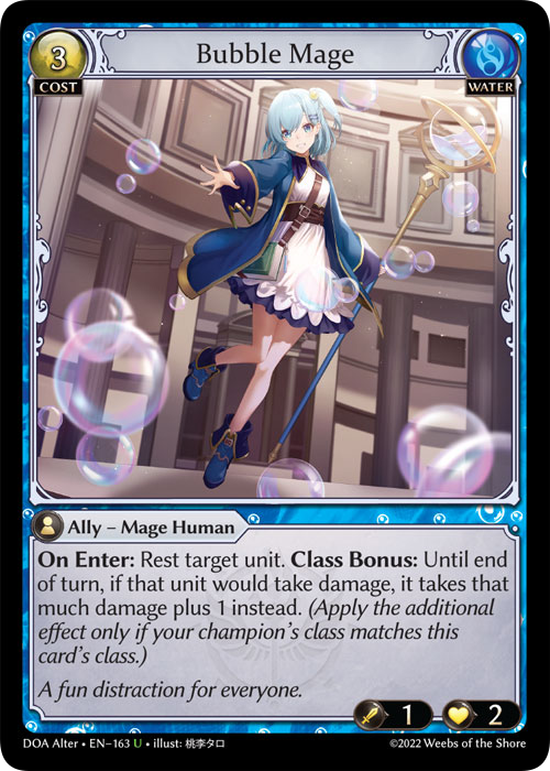 Scatter illusions and hamper your opponent’s plans with the charming Bubble Mage. This low-cost Water ally combines disruption and punishment in a single package. When it enters the field, you can Rest any target unit, disabling attackers or defenders at the perfect moment. If you control a matching class, the Class Bonus further increases your control: that rested unit will take 1 additional damage the next time it would be dealt damage this turn.