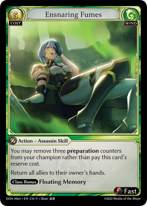 Unleash a powerful tactical reset with Ensnaring Fumes. This fast-speed Action card lets you clear the battlefield by returning all allies to their owners’ hands, disrupting your opponent’s strategy in an instant.
