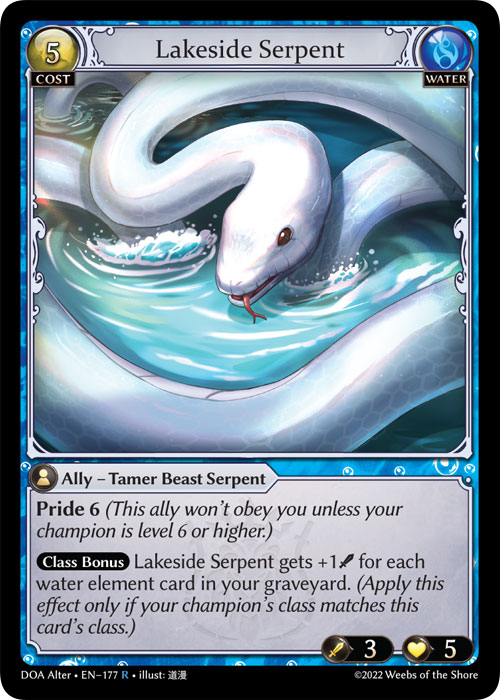 Class Bonus – Power Scaling: Lakeside Serpent gains +1 power for each Water element card in your graveyard. (This bonus only applies if your champion shares this card’s class.)